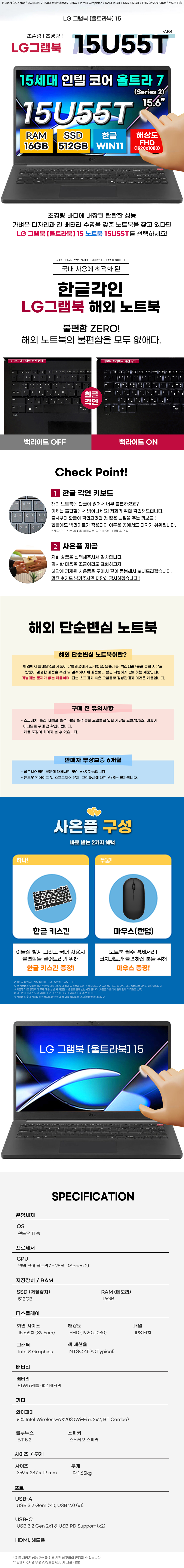 LG그램북 15U55T-AB4 15세대 16GB 512GB 울트라7 터치 노트북